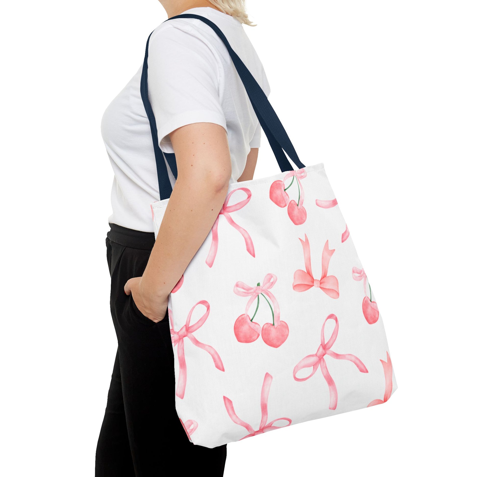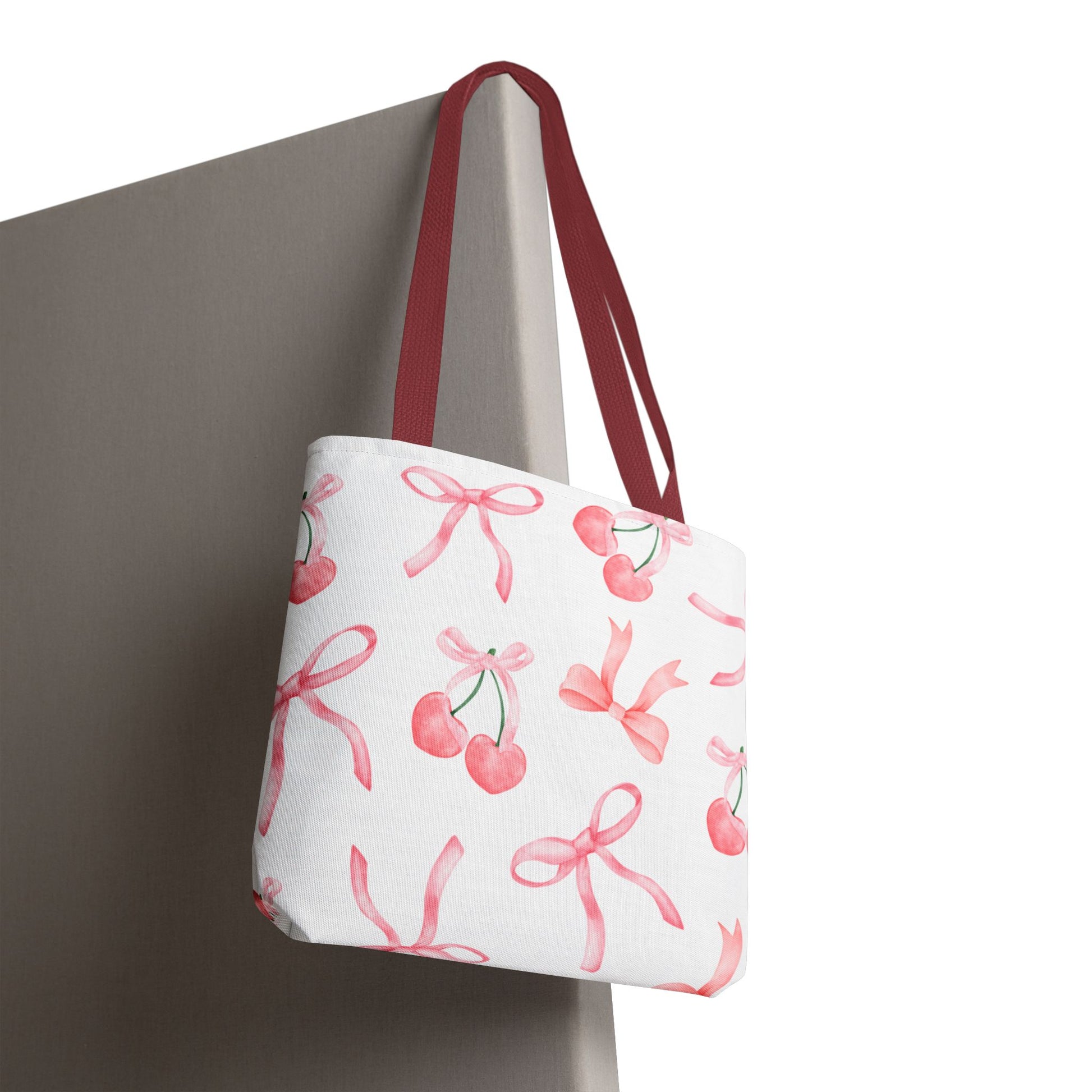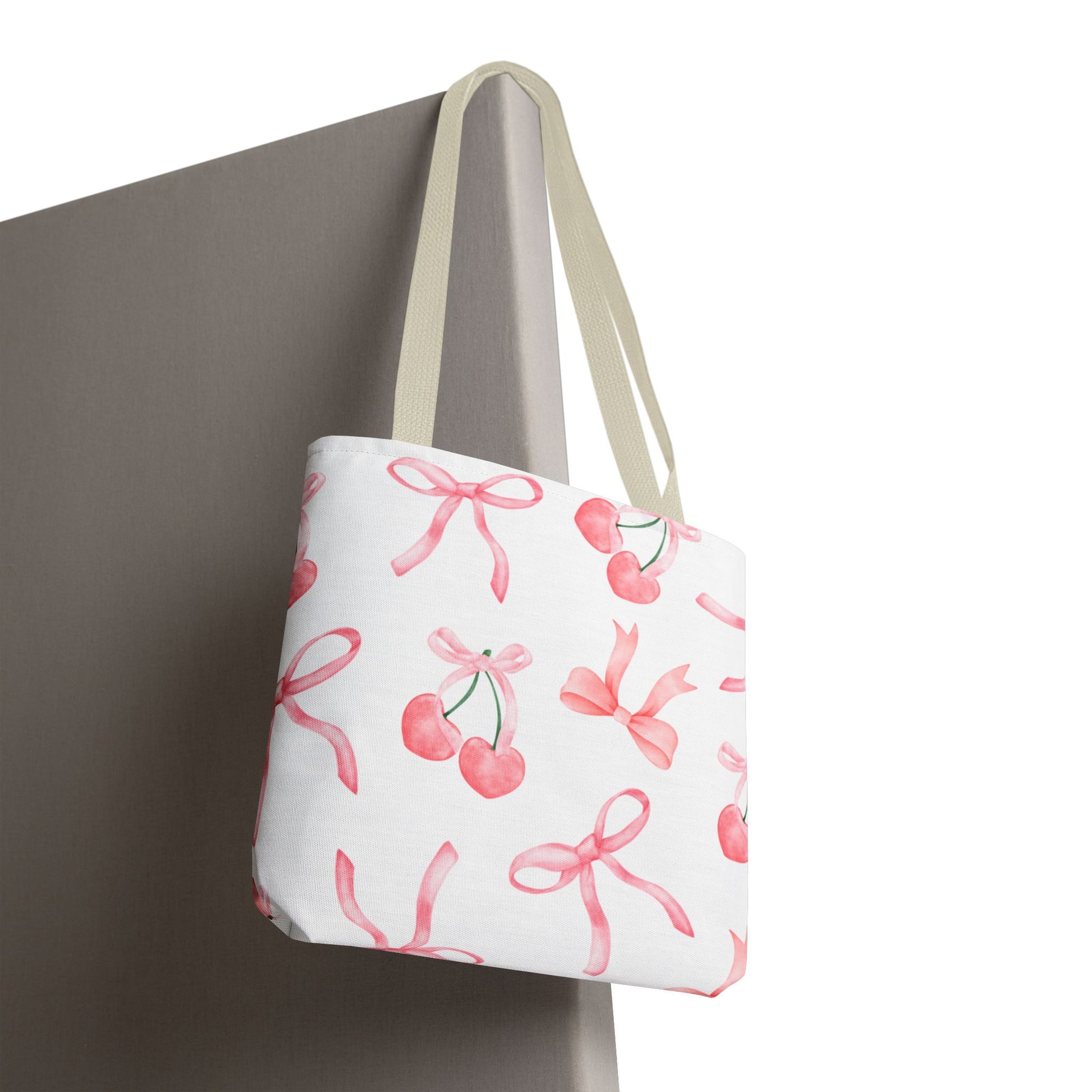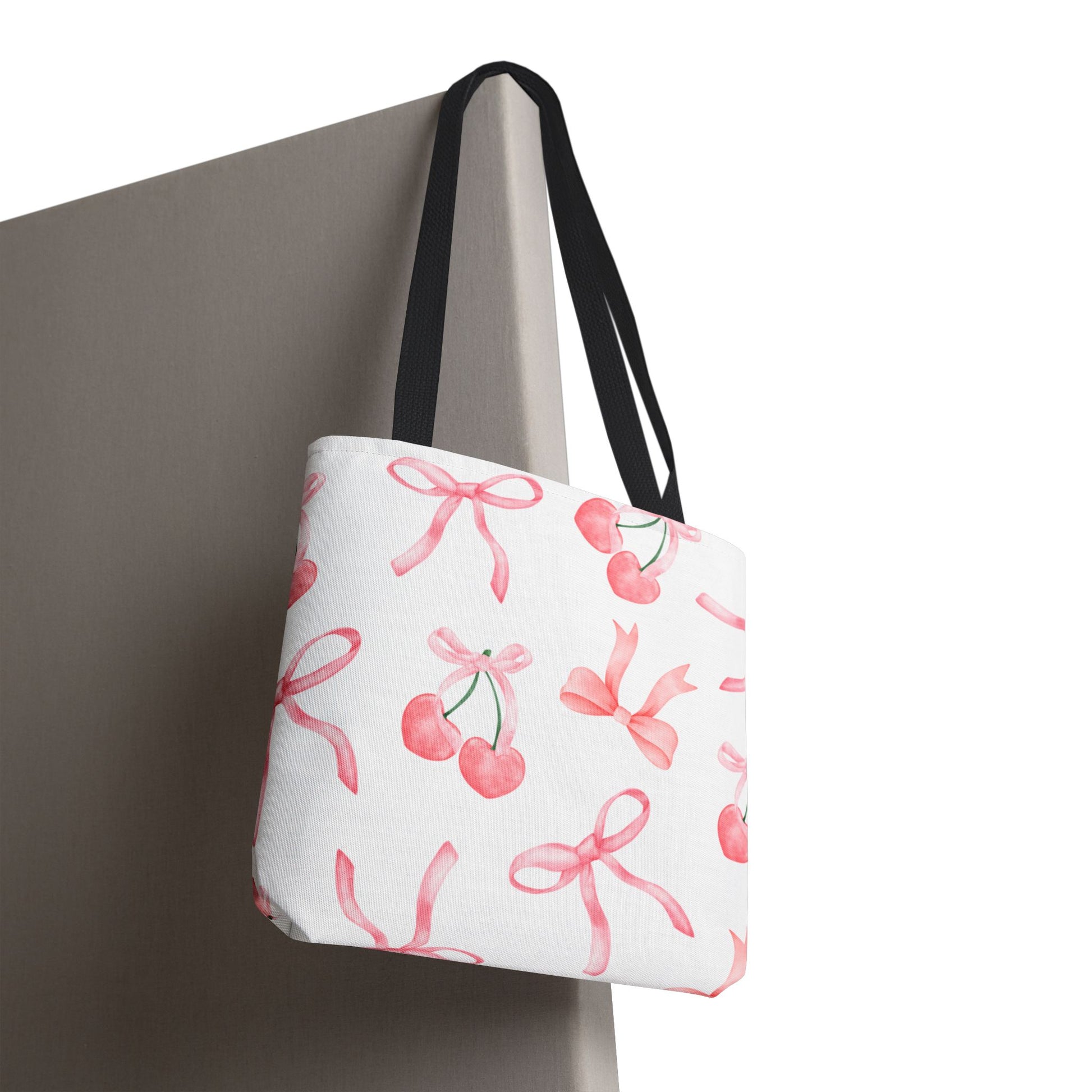 Pink Cherry Bow Tote Bag — Cute Watercolor Cherry Pattern