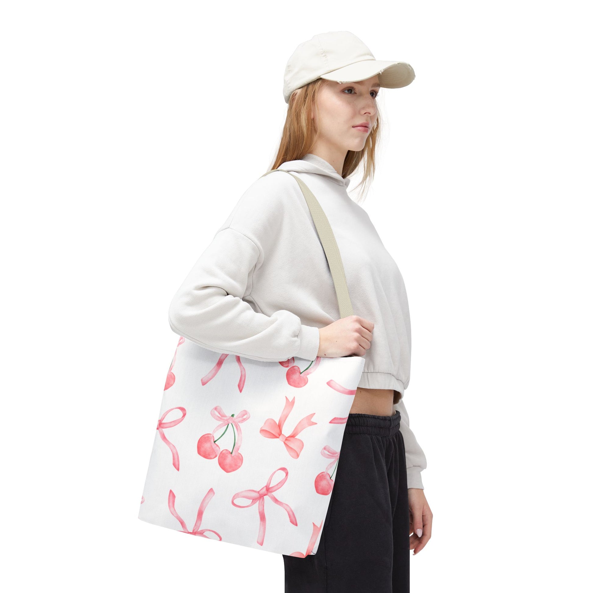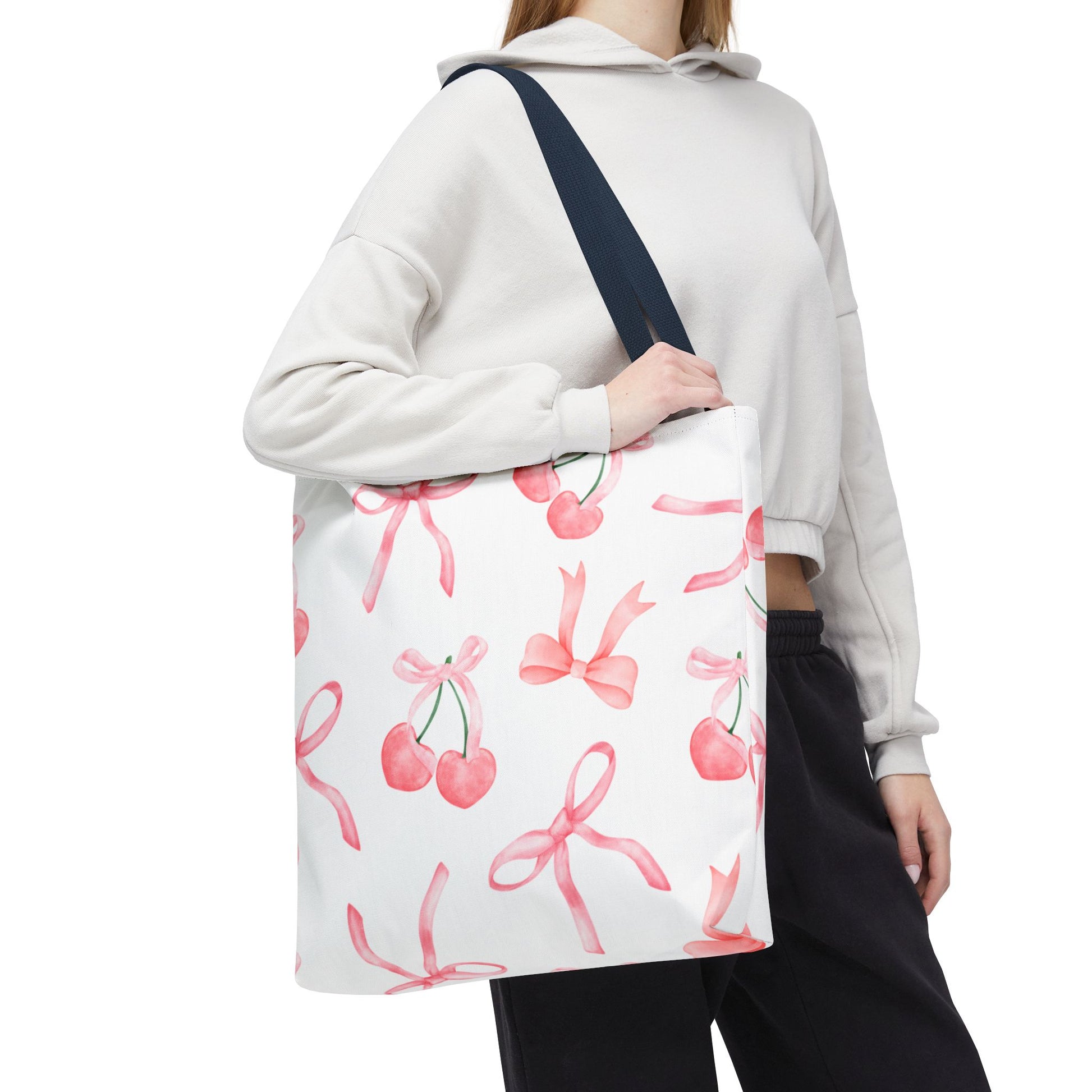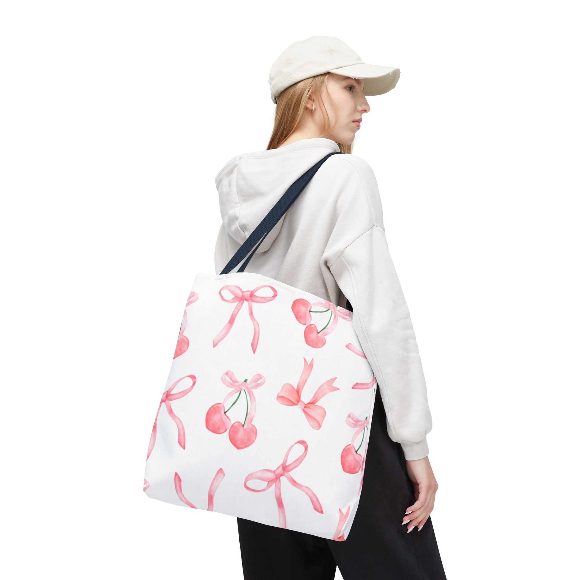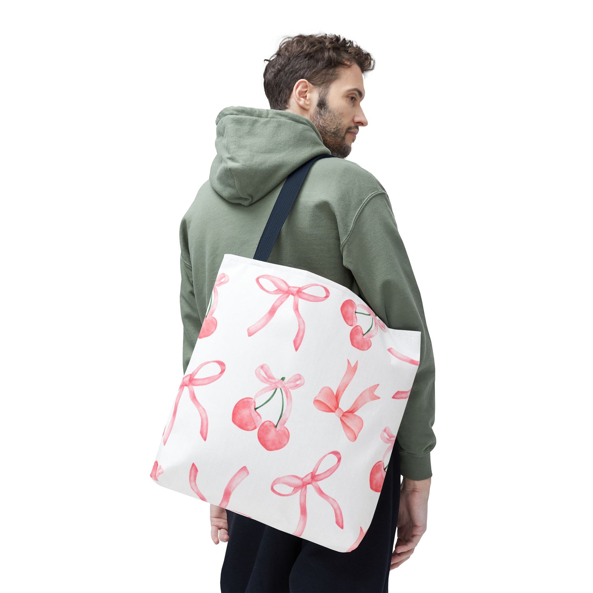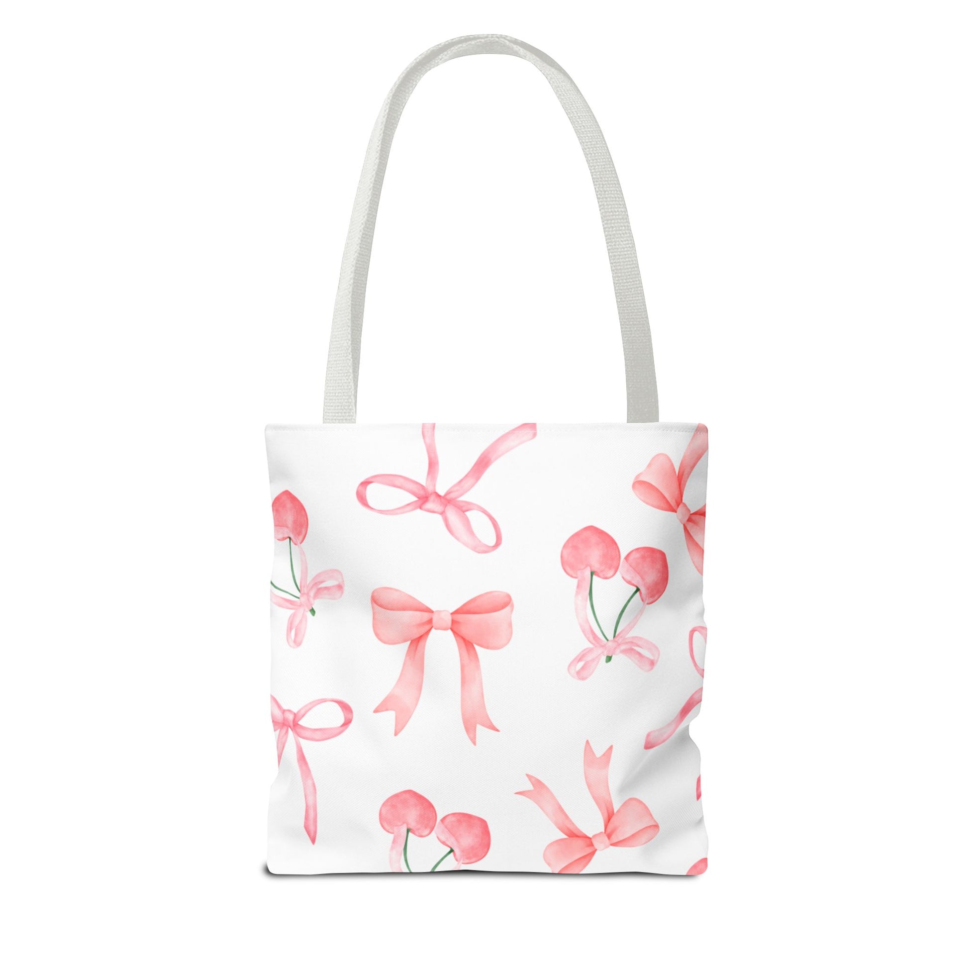 Pink Cherry Bow Tote Bag — Cute Watercolor Cherry Pattern