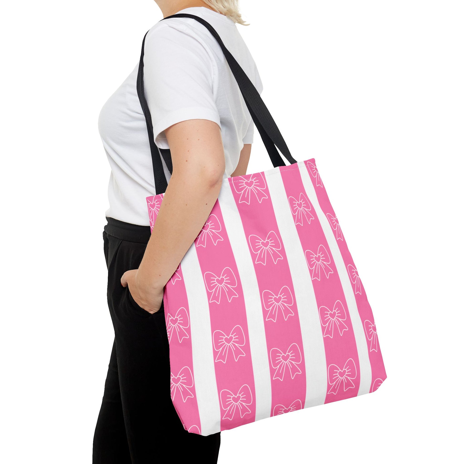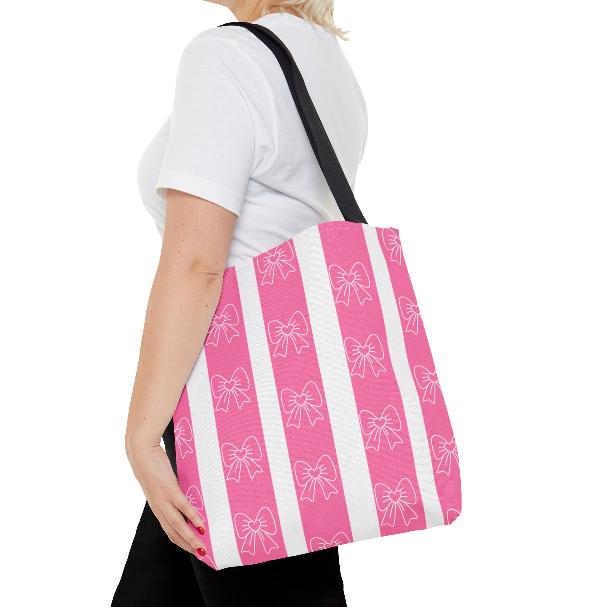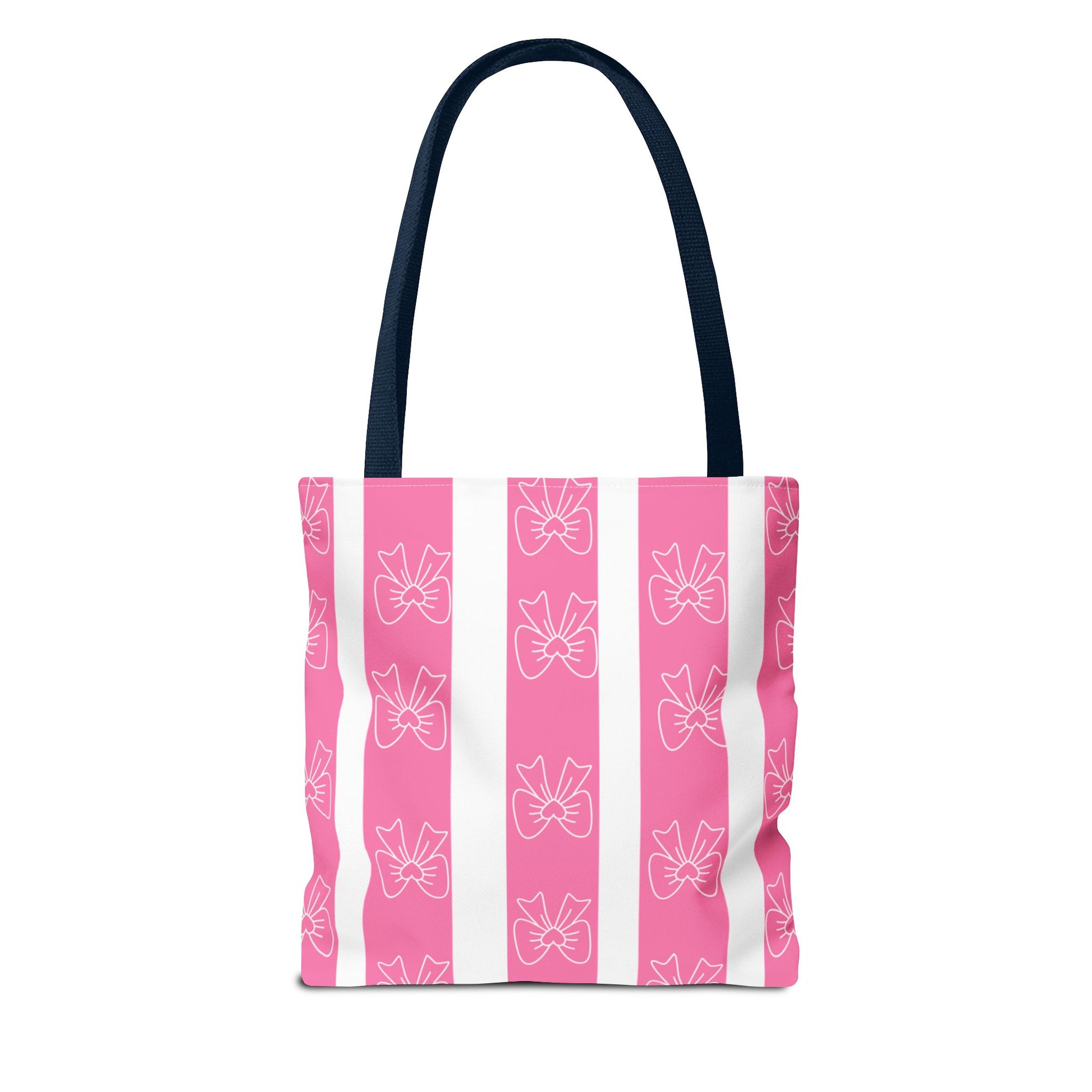 This cotton-handled tote brings playful charm to everyday errands and thoughtful outings. Wide vertical stripes in bubblegum pink and crisp white set a cheerful stage for the delicate hand-drawn bows that repeat across the fabric. The medium-weight polyester body keeps the bag structured while the boxed corners add real carrying room — groceries, notebooks, or a small market haul sit neatly without sagging. Black inner stitching and your choice of handle color give subtle contrast, while reinforced seams at the handles promise reliable wear. Carry it to a craft fair, a coffee date, or tucked under your arm for weekend shopping; it reads bright, feminine, and friendly without shouting for attention.