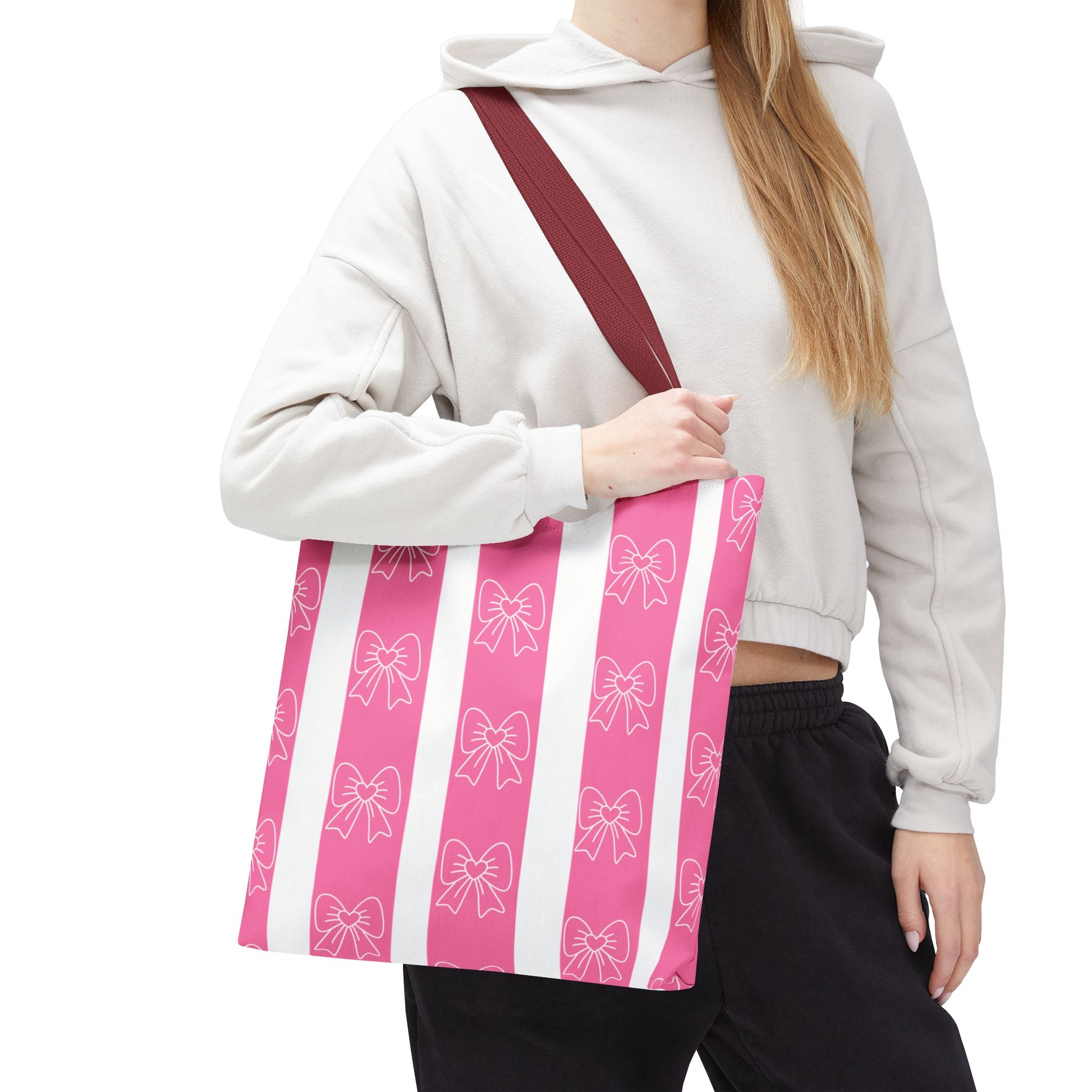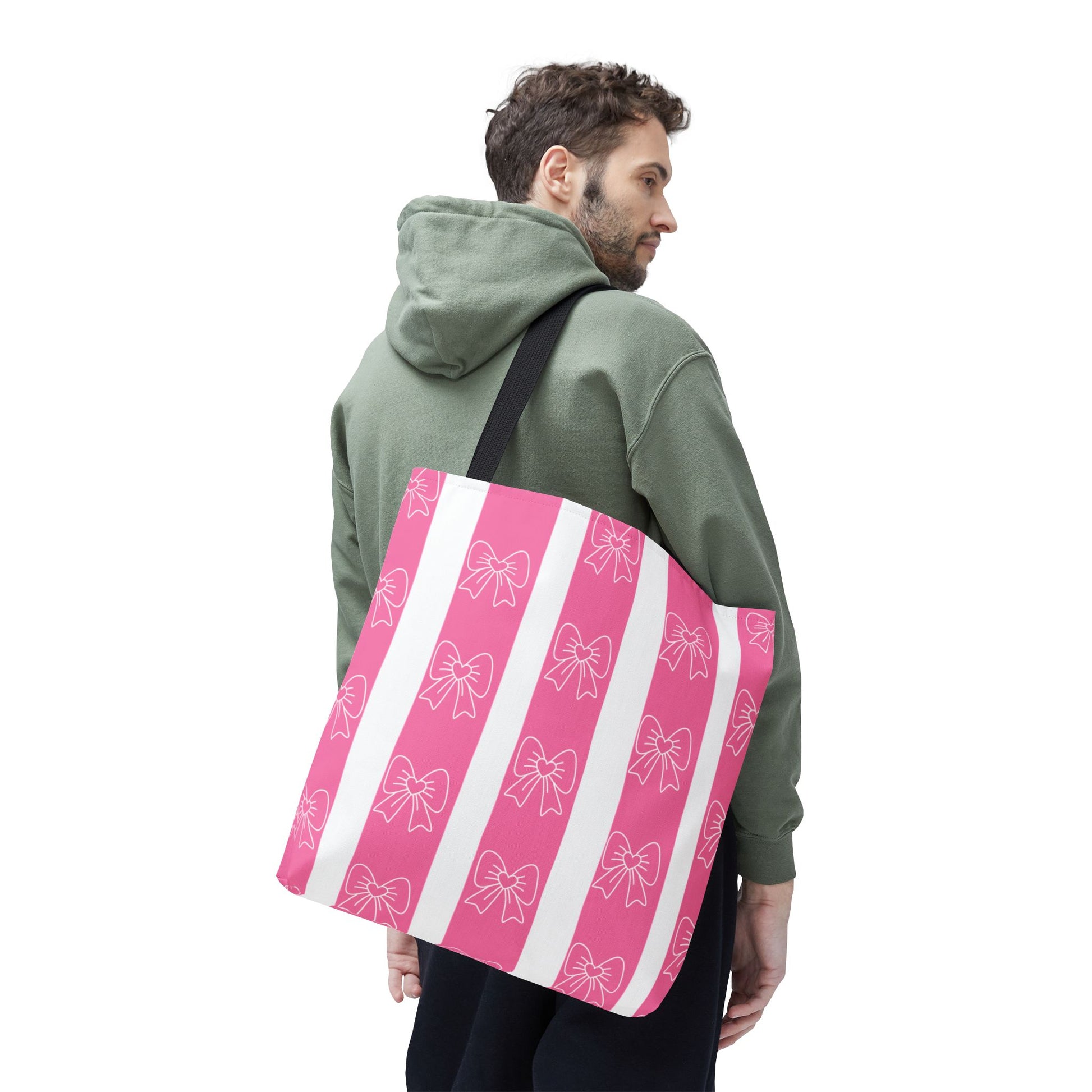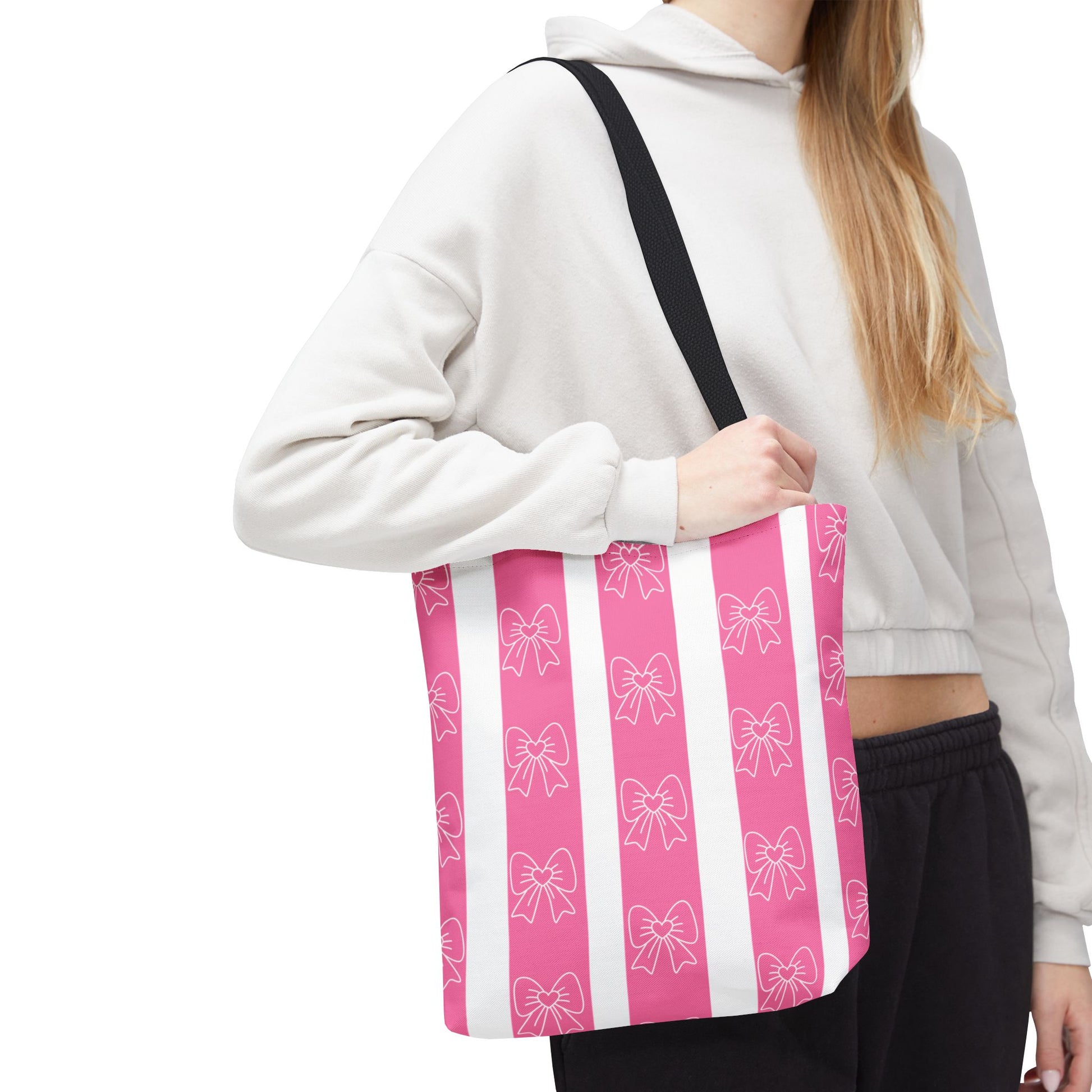 This cotton-handled tote brings playful charm to everyday errands and thoughtful outings. Wide vertical stripes in bubblegum pink and crisp white set a cheerful stage for the delicate hand-drawn bows that repeat across the fabric. The medium-weight polyester body keeps the bag structured while the boxed corners add real carrying room — groceries, notebooks, or a small market haul sit neatly without sagging. Black inner stitching and your choice of handle color give subtle contrast, while reinforced seams at the handles promise reliable wear. Carry it to a craft fair, a coffee date, or tucked under your arm for weekend shopping; it reads bright, feminine, and friendly without shouting for attention.
